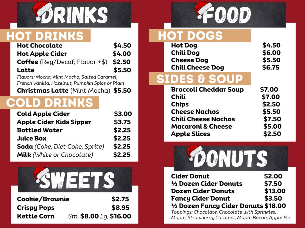 During the Christmas season, the Christmas Café at Gaver Farm becomes a cozy retreat where you can indulge in the warmth and flavors of the season. Open on Black Friday and select weekends, our food stand offers a delightful selection of hot drinks and treats that are perfect for enjoying before, during and after a festive day of tree-cutting and exploring the farm.